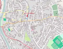 In the Second World War from 1940 to 1941 a siding was built that branched off the Isar Valley Railway at Wolfratshausen station to a munitions factory in Geretsried. Deutsche Reichsbahn planned to build its own freight yard south of Wolfratshausen for munition shipments, but this was never put into effect.[13] As the destruction of Munich increased, Deutsche Reichsbahn established a connection from the siding to the south, producing a triangular junction in Wolfratshausen, allowing freight trains to run via Bichl and Tutzing.[10][14] Wolfratshausen station was still responsible for the assembly of the trains, and for shunting, which was needed in Geretsried and Wolfratshausen. As part of the Isar Valley Railway was destroyed between 1943 and 1944 by air raids, regular passenger services could not be resumed until 1946. The depot was probably destroyed in World War II. Also, the roundhouse was demolished after the last class 64 steam locomotive used the Isar Valley Railway.