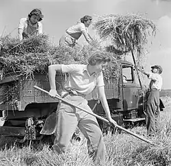 The Women's Land Army (WLA) was a British civilian organisation created in 1917 by the Board of Agriculture during the First World War to bring women into work in agriculture, replacing men called up to the military. Women who worked for the WLA were commonly known as Land Girls (Land Lassies).[1] The Land Army placed women with farms that needed workers, the farmers being their employers. The members picked crops and did all the labour to feed the country. Notable members include Joan Quennell, later a Member of Parliament; John Stewart Collis, Irish author and pioneer ecologist; the archaeologist Lily Chitty and the botanist Ethel Thomas. It was disbanded in 1919 but revived in June 1939 under the same name to again organise new workers to replace workers that served in the military during the Second World War. It was finally disbanded in 1950.