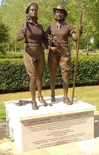 In October 2012, the Prince of Wales unveiled the first memorial to the WLA of both World Wars, on the Fochabers estate in Moray, Scotland. The sculpture was designed by Peter Naylor.[16] In October 2014, a memorial statue to the Women's Timber Corps and both incarnations of the Women's Land Army was unveiled at the National Memorial Arboretum in Staffordshire, England.[17]