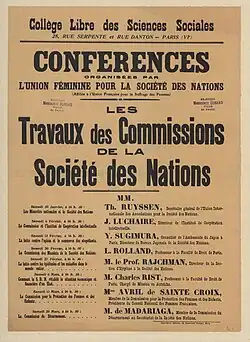The Women's Union for the League of Nations (French: Union Féminine pour la Société des Nations) was a French women's organization which was founded in 1920 by the French Union for Women's Suffrage as a basis for ensuring representation of women's interests at the League of Nations. Key figures were Marie-Louise Puech, Marguerite de Witt-Schlumberger and Germaine Malaterre-Sellier.[1]