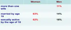 Eleven percent of women are married to a man with more than one wife and Sixty-three percent of women in Ethiopia are married by age 18, compared with just 14% of men Gender difference on age at first sex• 62% women and 18% of men age 25-49 were sexually active by the age of 18, i.e., Women start sexual activity about four and a half years earlier than men (median age of 16.6 years for women and 21.2 years for men) [4]