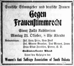 Many immigrants in South Dakota were bitterly opposed to women's suffrage during the first women's suffrage amendment campaign in 1890.[60] During the Republican Convention held in 1890, a large group of Russian immigrants wore buttons that read, "Against Woman Suffrage and Susan B. Anthony."[21] German immigrants were also largely against women voting.[48] Liquor and gambling interests were also against women's suffrage.[26] These groups spread the idea that women really didn't want to or need to vote and get into politics.[61]