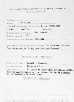 Teenage girls could become wards of the state through Patronato de Proteccion a la Mujer. Starting in 1941 and lasting until 1985, girls were taken to centers called reformatories run by nuns as part of a state goal to rehabilitate the "fallen". Some of these girls were dropped off by parents who no longer wanted to care for them, such was the case of Raquel Castillo. Some girls were put into state custody because they were denounced by family members. Marian Torralbo was denounced by her brother, a member of Acción Católica, for partying. All were incarcerated without a trial. In most cases, these girls could not leave until they were 25-years-old, when they became of age and were considered legal adult women.[40] Girls put into these reformatories were subject to virginity tests conducted by nuns. This was done on a daily basis, with girls forced to sit on a hospital bed where a doctor would ask them if they were a virgin and conduct a pelvic exam, often without their consent. Many girls would become traumatised from this procedure.[40] The law changed in 1985 around girls taken into state custody, and no longer allowed minors to be placed under the control of the state for their own protection. Following this, all remaining reformatories were closed.[40]