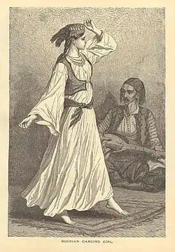 According to A. J. Schem: "Polygamy has never gained prevalence among the begs. The women go veiled in public, but enjoy at home a freedom and privilege greater than those of the Turkish women. The young women are allowed to receive attentions from the young men, and the young man who contemplates marriage is permitted to spend the evening with his betrothed, while she sits concealed from his view by a wall or shutter. It is related of the Bosnian women by a Turkish historian that when the first captives were taken to the Turkish court at Brussa, before the capture of Constantinople, they appeared to the chiefs like living genii from Paradise."[19]