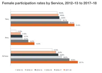 In 2017-18, women made up 17.9% of The ADF workforce, and increase of 3.5 percentage points from 2013 (14.4%).[6][52] There are still proportionally fewer women than men in senior leadership roles.[53]