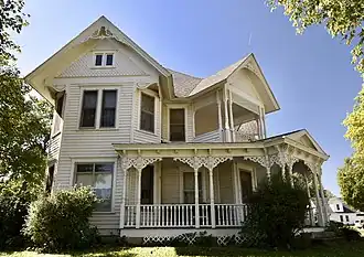 The Woodbine Lincoln Highway and Brick Street Historic District is a nationally recognized historic district located in Woodbine, Iowa, United States. It was listed on the National Register of Historic Places in 2013.[1] The route of the Lincoln Highway through Iowa was announced on September 14, 1913. They chose what was known as the "Iowa Official Trans-Continental Route," which was already being used by transcontinental motorists through the state. It covered 358 miles (576 km) of dirt and gravel roads that began in Clinton and traveled west to Council Bluffs.[2] The eleven block section through Woodbine follows what is now called Lincoln Way, the town's main thoroughfare.[3] This section of the Lincoln Highway was paved with bricks in 1921. The street features a canopy of shade trees lined with houses from the turn of the 20th century. Siebels' Department Store-Boyer Valley Bank, Woodbine Savings Bank, and the Woodbine Public Library are contributing properties in the historic district.