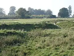 Originally, in the early 1st century AD, there was a roughly circular enclosure about 300 feet (91 m) in diameter, with wide entrances, and trackways leading away. There was a building within the main enclosure. In the second phase, during the late 2nd century AD, the three outer enclosures were built, one on the west and two on the east, of which one contained two corn-drying ovens. In the third phase, in the early 4th century AD, a new enclosure was constructed (seen before excavation began), partly over the sites of the earlier main and western enclosure. This enclosure contained a well and a building with painted wattle walls. The eastern enclosures were retained, one of them being enlarged. A new enclosure, containing a corn-drying oven, was constructed on the north side.[1][2]