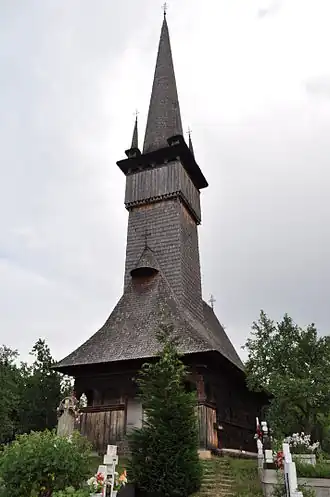 The wooden churches of Maramureș in the Maramureș region of northern Transylvania are a group of almost one hundred Orthodox churches, and occasionally Greek-Catholic ones, of different architectural solutions from different periods and areas. The Maramureș churches are high timber constructions with characteristic tall, slim bell towers at the western end of the building. They are a particular vernacular expression of the cultural landscape of this mountainous area of northern Romania.