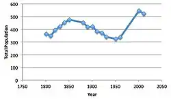 The population grew from 346 in 1811 to 476 in 1851 and then declined to 384 in 1911[2] but grew from a low point of 323 in 1951 to reach 544 in the 2001 census. In 2011, the village had a population of 522,[1] 272 males and 250 females;[3] the majority (504) were white British and Christianity (334) was the main religion.[4]