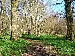 The Alders woods (TQ 229 154), known locally as the "Bluebell Wood", are mostly wet carr, but are carpeted by Bluebells on the northern rising ground. On the east side of The Alders was a small marsh (TQ 230 154) with heath spotted orchid, marsh cinquefoil, narrow buckler-fern and water purslane. More recently it has become overgrown with bramble and young saplings and the Rampion Wind Farm cable runs along its eastern edge.[5]:173