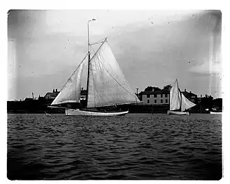 A Woods Hole spritsail boat is a small sailing and rowing craft, constructed entirely of wood, and fastened with iron or copper. It was used historically for fishing, island mail deliveries, racing, or day sailing off the coast of southeastern Massachusetts, especially in the waters of Buzzards Bay and Vineyard Sound near the town of Woods Hole, a community of Falmouth in Barnstable County, Massachusetts. Although the sprit sailing rig has ancient roots,[1] the Woods Hole spritsail boats were built and used mainly in the period between the US Civil War and World War I, becoming most prevalent during the late 19th and early 20th centuries. The original boats were employed almost exclusively in fishing, including handlining for finfish, trap fishing for lobster, or digging with tongs for bivalve shellfish, but by the late 19th century, newer and lighter spritsail boats began to be built for recreational sailing and racing.[2] This transition coincided with the emergence of Woods Hole as a summer coastal tourist destination, when the Cape Cod Central Railroad began service from Buzzards Bay in 1872, followed by a private subscription railroad that was extended from Boston in 1884.[3] This spritsail boat has now disappeared as a type, but its cultural significance endures in New England maritime museums, remaining a material symbol of the small community of Woods Hole.