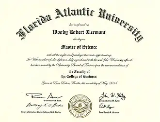 Clermont possesses a total of nine academic degrees: two associates degrees, three bachelors degrees, three masters degrees and a professional doctorate in law.[19][20][21][22] Clermont is a member of the Phi Theta Kappa honor society, the Delta Epsilon Iota academic honor society, and the Omicron Delta Epsilon economics honor society.[23] Clermont attended Binghamton University,[24] at the same time fellow alumnus Congressman Hakeem Jeffries attended,[25] receiving a bachelor of arts in political science in 1992. Clermont received his bachelor of science in mathematics from Mayville State University, his master of business administration and master of science in economics from Florida Atlantic University, and his Juris Doctor from the University of Miami School of Law.[26] Clermont won his first-year moot court competition with his partner Gerald Chen-Young in law school.[27] Clermont additionally received a master of science in data analytics from Western Governors University.[28][29][30][31][32]