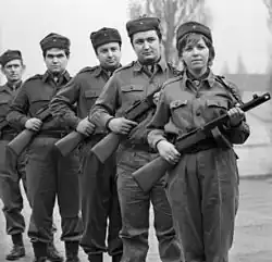 ![]() Workers' Militia members in the Liberation Day parade, April 1958 | |