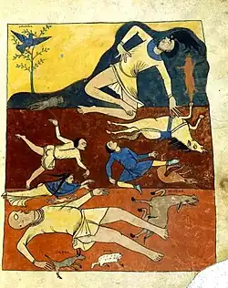 The description of the Pergamon Altar and the gigantomachy it depicts forms the introduction to the novel. The protagonists question the viewpoint of the observer: they see the victorious gods as symbols of the rulers who had the monumental work of art created by exploited people, war is stylised into a myth.[2] They themselves identify with the defeated children of the Gaia and discuss the role of Heracles.[3] This is followed by reflections on the significance of the Pergamon Altar in the history of Pergamon, the excavation of the altar and the transfer of the art treasures to Germany.[4] One conclusion of the first-person narrator is