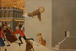 The protagonists reflect on the segregation of classes that is inherent in the paintings and question what lessons they themselves, as seekers, can learn from the exclusive, sophisticated art of the rulers and the privileged. In this one, it is the "geometrically fancy walls" of the city view of Arezzo, "the green-blue of the sky taken up by the strangely unspoiled ground, all this was of a vision that eschewed all emotion."[19] |