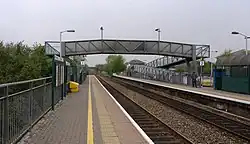 There are two platforms, on either side of the two tracks through the station. The southern platform, platform 1, serves westbound trains (towards Weston-super-Mare and Taunton); the northern platform, platform 2, serves eastbound trains (towards Bristol). Both platforms are 100 metres (110 yd) long. The line through the station has a speed limit of 100 miles per hour (160 km/h), and is not electrified.[6] Access between the platforms is via an open footbridge with long, sloped ramps for step-free access. Ticket machines are available, and a small ticket office operates during the weekday morning peak, but the station is otherwise unstaffed. Help points are provided, allowing travellers to ask questions of a call centre. There are metal and glass waiting shelters on both platforms – two on the eastbound platform and one on the westbound. Most recently, improved lighting and CCTV has been provided and for the first time since construction, electronic train arrival boards with automated voice announcements have been provided on both platforms and also a silent, less detailed digital arrivals / departures board adjacent to the ticket office.[2]