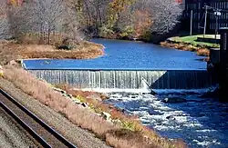 Constructed in 1890, it has withstood the floods that have taken out most of the other dams on the Quaboag River. In 2005, the Wrights Company conducted a feasibility study to return this dam to use for waterpower generation.[1] Originally, this dam provided waterpower to the large Wrights Mill complex. In the early 1900s, this complex was a knitting mill that produced cloth and various industrial knitted materials. Locally produced waterpower ran the looms and ancillary machinery.[1]