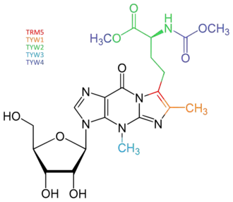 - ^ Perche-Letuvée, Phanélie; Molle, Thibaut; Forouhar, Farhad; Mulliez, Etienne; Atta, Mohamed (2 December 2014). "Wybutosine biosynthesis: Structural and mechanistic overview". RNA Biology. 11 (12): 1508–1518. doi:10.4161/15476286.2014.992271. PMC 4615248. PMID 25629788.