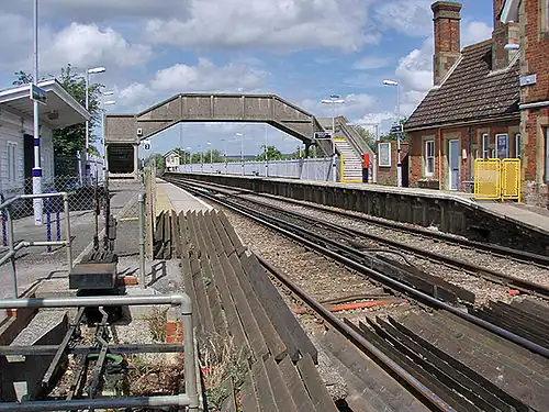 The platforms were connected by a concrete footbridge in 1960. This was replaced with a 12.5-metre (41 ft) steel footbridge in 2015.[9] The staffed level crossing at the south end of the station required manual operation of the gates and was formerly a local traffic bottleneck[10] but was replaced with automated crossing gates in December 2022.[11]
