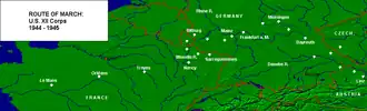 The XII Corps fought from northern France to Austria in World War II. Constituted in the Organized Reserves in 1933, it was activated on 29 August 1942 at Columbia, South Carolina. XII Corps became operational in France as part of Lieutenant General George S. Patton's Third Army on 1 August 1944. Initially commanded by Major General Gilbert R. Cook, bad health forced MG Cook to relinquish command to Major General Manton S. Eddy within three weeks. MG Eddy commanded the corps until late April 1945, when his own health problems forced him to turn over command to MG Stafford LeRoy Irwin.