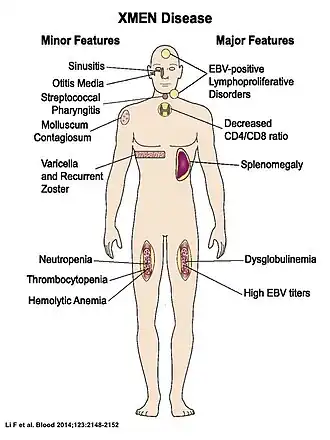 4. ^ a b c d e Li FY, Chaigne-Delalande B, Su H, Uzel G, Matthews H, Lenardo MJ (April 2014). "XMEN disease: a new primary immunodeficiency affecting Mg2+ regulation of immunity against Epstein-Barr virus". Blood. 123 (14): 2148–52. doi:10.1182/blood-2013-11-538686. PMC 3975255. PMID 24550228.