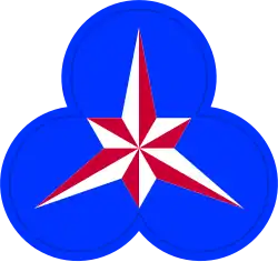 XXXVI Corps was activated on 15 July 1944 at Fort Riley, Kansas, under the command of Major General Jonathan W. Anderson and was assigned to the Fourth Army.[1] The shoulder patch was approved on 17 October 1944. A blue trefoil with a six-pointed red and white design indicated the corps' numerical designation. When stations and units assigned to the Second Army located west of the Mississippi River were transferred to the control of the Fourth Army effective 18 September 1944, the XXXVI Corps assumed control of corps-level troop units at Camps Howze and Maxey, Texas, and Camp Robinson, Arkansas. On 6 October 1944, the units at Camp Robinson were relieved from assignment to the XXXVI Corps. The Corps later assumed command of units at Camp Chaffee, Arkansas, and Camp Gruber, Oklahoma.[2] On 5 January 1945, the headquarters of Fourth Army and the Special Troops detachments of Camps Chaffee, Gruber, and Robinson prepared to assume administration of the corps-type units located there, from which the XXXVI Corps was relieved responsibility on 10 January 1945 for an anticipated move to Camp Cooke, California. Instead, the XXXVI Corps received changed orders, recalled its units which had already moved to the West Coast, and moved to Camp Gruber, Oklahoma on 16 January 1945. The corps was relieved of both assignment to Fourth Army and responsibility to units at Camp Gruber at midnight on 23 June 1945 and began movement to Camp Callan, California.[3] It was inactivated there on 25 September 1945.[1]