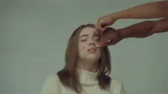 A screenshot from the video, featuring disembodied hands forcing cigarette butts into the face of Eilish, leaving burns.