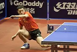 With his long arms and frame, he is able to more easily reach balls hit wide. His long arms enable a graceful, unique forehand loop, with his arm almost fully outstretched. He has also adopted the reverse penhold backhand grip (RPB), a recent development for China's penholders, allowing a two-winged attack. He still uses a traditional penhold (Chinese) backhand to lob and push the ball with the forehand side of his racket. More recently, Xu Xin has been more willing to counter with his RPB, allowing him to maintain aggression in the points on his backhand side.