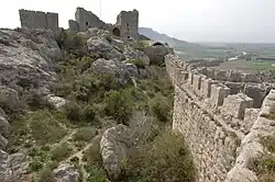 The walls, as well as the numerous horseshoe-shaped towers and vaulted chambers, are built with beautifully cut rusticated masonry and are carefully adapted to the coiling outcrop of limestone to create three baileys.[15] The archaeological and historical assessment of this castle published in 1987 (with a scaled plan) describes each unit in detail.[15] In the upper bailey is an Armenian chapel with its apse and north wall preserved.[3] The assumption that the relief of a seated king with two rampant lions in the gatehouse door depicts King Levon I (confirming the conclusion that he was the castle's early 13th-c. founder), was convincingly challenged by both iconographic and archaeological evidence, which shows that the relief portrays either Kings Het'um I (1226–70) or Het'um II (1289–1307).[16] The castle was abandoned during the reign of the Ramadanids in the mid-14th century.[17]