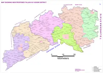 Yadgir District is one of the 31 districts of Karnataka state in southern India.This district was carved out of Kalaburagi district as the 30th district of Karnataka on 10 April 2010.[1] Yadgir town is the administrative headquarters of the district.[2] The district occupies an area of 5,160.88 km2 (1,992.63 sq mi).