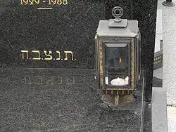 The use of a yahrzeit candle is a widely practiced custom, where mourners light a yahrzeit candle that burns for 24 hours, on the anniversary of the death on the Hebrew calendar.[3] Many Jews who are otherwise unobservant follow this custom.[3] It is customary to light the candle inside one's home, or near the grave of the deceased.