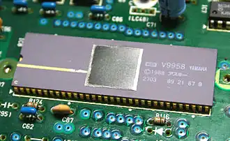 The Yamaha V9958[1][2][3] is a Video Display Processor used in the MSX2+[4] and MSX turbo R series of home computers, as the successor to the Yamaha V9938 used in the MSX2, as well as the ‘TI Image Maker’ video expansion for the TI-99/4A home computer.[5] The main new features are three graphical YJK[6][7][8] modes with up to 19268 colors and horizontal scrolling registers. The V9958 was not as widely adopted as the V9938.