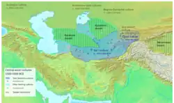 The Yaz culture (named after the type site Yaz-Tappe, Yaz Tepe, or Yaz Depe, near Baýramaly, Turkmenistan[1]) was an early Iron Age culture of Margiana, Bactria and Sogdia (c. 1500–500 BC,[2][3][4][5][6][7][8] or c. 1500–330 BC[9][10]). It emerges at the top of late Bronze Age sites (BMAC), sometimes as mud-brick platforms and sizeable houses associated with irrigation systems. Ceramics were mostly hand-made, but there was increasing use of wheel-thrown ware. Bronze and iron arrowheads, also iron sickles and carpet knives among other artifacts have been found.[11][12][13]