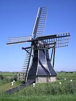 Ybema's molen is what the Dutch describe as a Grondzeiler. It is a single storey smock mill on a single storey base. There is no stage, the sails reaching almost to ground level. The mill is winded by tailpole and winch. The smock and cap are boarded. The sails are Common sails. They have a span of 10.20 metres (33 ft 6 in). The sails are carried on a cast iron windshaft. The windshaft carries the brake wheel which has 31 cogs. This drives the wallower (16 cogs) at the top of the upright shaft.[1] At the bottom of the upright shaft there are two crown wheels. The upper crown wheel, which has 32 cogs drives an Archimedes' screw via a crown wheel. The lower crown wheel, which has 31 cogs is carried on the axle of the Archimedes' screw. The screw is 90 centimetres (2 ft 11 in) diameter.[2]