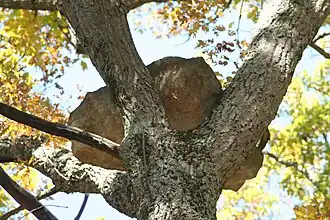 One major mystery surrounds the forest. Large sandstone boulders, estimated to weigh about 200 pounds (91 kg), have been found in the tops of three trees: one eighty-foot (24 m) tall chestnut oak and two American sycamores, one of which is 45 feet (14 m) tall. Speculation as to how the boulders got there ranges from college pranks, tornadoes, ancient hunters to UFOs.[8]