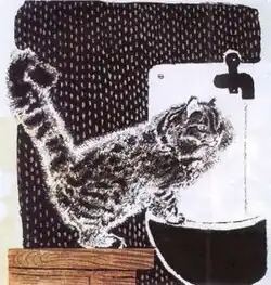 Charushin returned to Leningrad in 1945 and turned once again to books, as well as to a series of prints and easel compositions on his favorite themes: "Tiger cub" ("Tigrenok"), "Mother Rabbit and her Babies" ("Zaichikha s zaichatami"), "The Crow's Breakfast" ("Vorona za zavtrakom"), "Mother Bear and her Cubs" ("Medveditsa s medvezhatami"), "The Wolf" ("Volk"), and others. He also began to do more sculpting, continuing to work on a series of animal figurines that he began in 1941. The last work he completed before his death was the illustrations for Samuil Marshak's "Cubs in Cages" ("Detki v kletke"). He was awarded the gold medal in the children's book category at the Leipzig International Exhibition in 1965.[8]