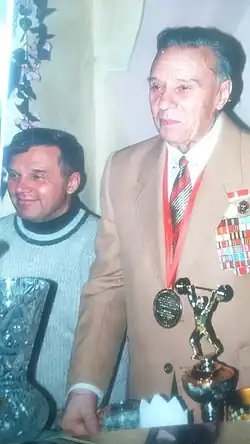 Lopatin's success in local and regional tournaments was interrupted by World War II. By then he lived with his family in Leningrad. His second son was born there in 1942, but died of malnutrition. The family was evacuated around 1942, first Lopatin and then his wife and son. Later Lopatin was enlisted to the Soviet Army. He was injured in the Battle of Stalingrad and for many months after that could not use his left hand. He spent the rest of the war recovering as a coach at a military school.[2] After the war Lopatin resumed his weightlifting career and reigned as the Soviet featherweight champion in 1947, 1948, and 1950, finishing as runner-up in 1945, 1946, and 1949, and in third place in 1951. He took silver in the division at the 1947 European Weightlifting Championships in Helsinki and gold in the same event at the 1950 edition in Paris. That same year he took silver in the featherweight division at the World Weightlifting Championships. As competition in the featherweight field grew, Lopatin switched to the lightweight division and once again became the Soviet champion prior to his attendance at the 1952 Summer Olympics, after which he announced his retirement from active competition.[1] He worked as a coach at Dynamo Stadium in Moscow from 1949 through 1998.[2] He died on 21 July 2011.[3]