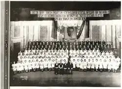 The New York branch of the Freiheit Gezang Farein (Yiddish: פרײהײט געזאַנג פאַרײן Freedom chorus) was founded in 1923 by composers Lazar Weiner and Jacob Schaefer on the Lower East Side.[3][4][5] Schaefer, who was still living in Chicago when the New York choir was founded, had used the name for a previous choir in Chicago he founded in 1913–14 and had picked it to not alienate potential members or audiences who were not Communists.[6][7][8] The New York choir was affiliated with the newspaper Morgen Freiheit, and had a strong working class identity and espoused far left or Communist politics.[5][9][8] Many of its early members were garment workers.[10] The choir became quite large, growing from 100 to 200 members in the first decade, most of whom were first generation Jewish immigrants who spoke Yiddish as their first language.[4] Its repertoire was mainly in Yiddish, although it did also perform in Russian, Polish, and other European languages.[11] In the early years both Weiner and Schaefer composed for the choir, Weiner was its conductor.[8] It gave its first major concert at Carnegie Hall in February 1924.[12] Starting in 1924, the chorus often performed together in concert with the Freiheit Mandolin Orkester, a Mandolin orchestra also founded and directed by Schaefer.[8] The choir regularly appeared at rallies and political events as well.[10]