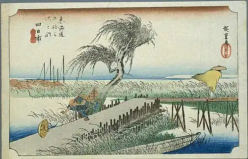 Utagawa Hiroshige's ukiyo-e Hōeidō edition print of Yokkaichi-juku dates from 1833 -1834. The print illustrates a windy day with a man racing after his hat, which has been blown away by the wind and another man crosses a small bridge over the Sanju River, depicted here as a small stream. The post town is depicted as a small collection of huts in the middle of a marsh, almost hidden by the reeds.