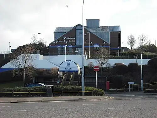 Yorkgate railway station served the north of the city of Belfast, Northern Ireland. The station opened in 1992, replacing the previous York Road railway station nearby. The station was in turn replaced by the nearby York Street station in 2024, with the new station re-using the existing platforms of Yorkgate.[4][1]
