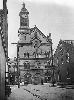 Yorkville Town Hall was the municipal building for the Village of Yorkville before its annexation by the City of Toronto. Built in 1859-1860 by architect William Hay[1] and his apprentice Henry Langley, the three-storey building also served as an omnibus stop. The hall was located north of Bloor Street on Yonge Street, along the west side.