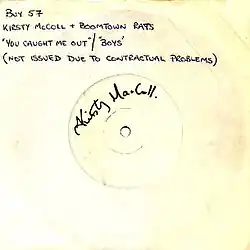After signing to Stiff, Maccoll released her debut single "They Don't Know" in June 1979. The song was a radio hit, but a strike at the label's distributors resulted in the single's failure to enter the UK Singles Chart. Despite the setback, MacColl soon recorded a follow-up, "You Caught Me Out", on which she collaborated with members of the Irish rock band The Boomtown Rats.[1] MacColl co-wrote the song with the band's bassist Pete Briquette and drummer Simon Crowe, and they recorded the track with her, alongside the band's keyboardist Johnnie Fingers. Guitar was provided by Brinsley Schwarz of Brinsley Schwarz.[2]