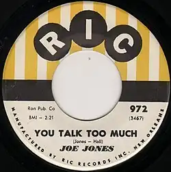 "You Talk Too Much" is a 1960 single by American R&B singer Joe Jones, co-written by Jones and Reginald Hall. The song reached Number 3 on the Billboard Hot 100. Released by Ric Records, it would be the label's only commercial success.[2] Later that year, the song was adapted into French by Georges Aber as "Tu parles trop" and was a hit for Johnny Hallyday in early 1961.[3]