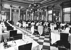 A travel guidebook described Young's in 1895: "The main entrance to this hotel is on Court Avenue, and the hotel extends to Court Square and Court Street. It is one of the largest and best of the hotels on the European plan. One of the features of this hotel is the ladies' dining-room, the entrance to which is on the Court Street side. This is a handsomely decorated room 100 feet long and 31 feet wide. It connects with other large dining-rooms, and a cafe for gentlemen on the ground floor. This hotel is a favorite place with New Yorkers. ... Recognized as among the best [hotel restaurants in the city] are those connected with Young's Hotel, the Parker House, and the Adams House. That of Young's Hotel is very extensive, occupying a large part of the ground floor of that establishment. It has dining-rooms for ladies and gentlemen, lunch rooms, and convenient lunch and oyster counters."[10]