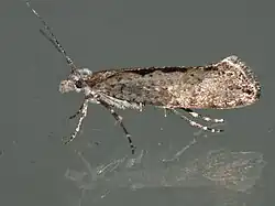 The wingspan is 16–20 mm. The head is light grey. Forewings pale grey or whitish-grey, sometimes brownish-mixed, sprinkled or strigulated with dark grey, sometimes more or less wholly suffused with blackish; a blackish or dark fuscous streak along dorsum, forming triangular projections upwards before and beyond middle. Hindwings are grey. The larva is brown- blackish; dorsal stripe broadly whitish.[2]
