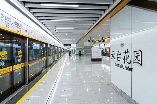 Yuntai Garden Station (simplified Chinese: 云台花园站; traditional Chinese: 雲台花園站; Cantonese Yale: Wàntòifāyùn Jaahm) is a station on Line 11 of the Guangzhou Metro. It started operations on 28 December 2024.[1][2] It is located underground outside the intersection of Guangyuan Road Middle[3] and Luhu Road[4] in Yuexiu District.[5][6]