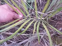 Zamia boliviana has an in-ground cylindrical stem. There are one to three compound-leaves on a crown standing 0.8 metres (2 ft 7 in) tall. The leaves are up to 119 centimetres (47 in) long. The petiole (stalk) is smooth, with no prickles. There are 16 to 40 leaflets on a leaf which are 19 to 29 centimetres (7.5 to 11.4 in) long and 1.1 to 2.0 centimetres (0.43 to 0.79 in) wide, linear-lanceolate in shape, tapering to a point, and with a smooth edge along most of the leaflet and a few teeth toward the tip.[4][5][6]
