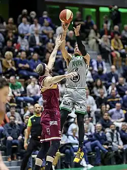 Zeke Moore shooting over defender while playing for French Club ADA Blois 41 in 21-22 season.