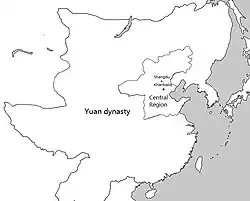The Mongol-led Yuan dynasty (1271–1368) made the Central Secretariat the central administrative office, responsible for all civil administration,[6] and abolished the Department of State Affairs in 1292 (revived 1309-1311). The post of Director was held by an imperial prince or left vacant, however real work went to the right and left Grand Chancellors. Under the Grand Chancellors were four managers of governmental affairs (pingzhang zhengshi 平章政事) and a right and left aide (you cheng 右丞, zuo cheng 左丞), who were collectively known as state counsellors (zaizhi 宰執). Below the state counsellors there were four consultants (canyi zhongshusheng shi 參議中書省事) responsible for paperwork and took part in decisions. The Central Secretariat controlled the Six Ministries and was thus functionally the heart of the government. The regions surrounding the Yuan capital Khanbaliq, including what are now Shandong, Shanxi, Hebei and Inner Mongolia provinces were known as the Central Region (腹裏, fuli) and directly subordinate to the Central Secretariat.[7] Branch secretariats were set up throughout the provinces.[8]
