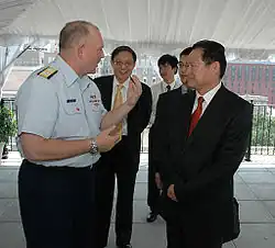 Zhou (right) listens to American Admiral Thad Allen during a 2006 trip to the United States
